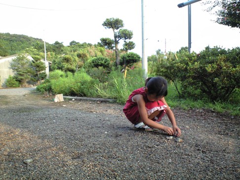 1日目夕涼みがてらに実家の玄関前で遊ぶ娘をパチリ。