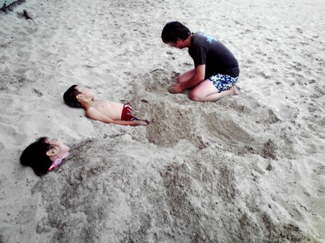 娘に砂をかけて喜んでいた息子ですが、自分がかけられるとは思っていなかったようで、大はしゃぎでしたw