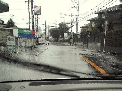 帰宅途中の道路、中央のラインが雨水で見えなくなってました。まるで川の中を