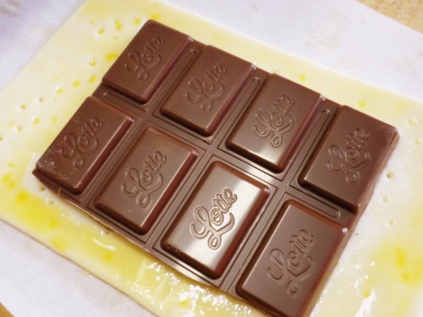 6.板チョコを3等分にして、パイシートに乗せて、チョコが乗っていない部分のパイシートに卵黄を塗ります。