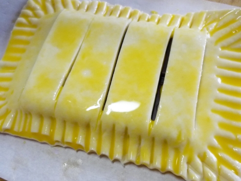 7.切込みを入れたパイシートを上にかぶせて、フォークの背で端を押さえ込み、全体に卵黄を塗ります。