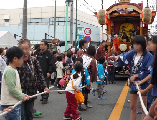 町内のはやし連に娘の友達がいたので、娘も山車を引かせてもらいました。