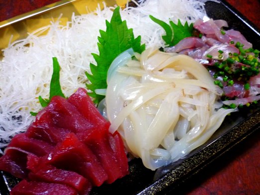 準備してあったツマ付のプラ容器に、自分で捌いたアジとイカとおまけのマグロを盛り付けました。